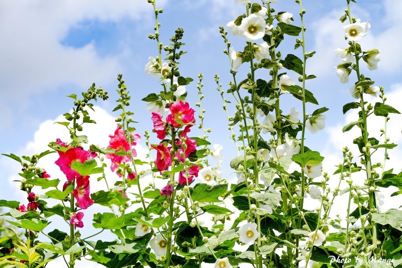 タチアオイ アオイ科 おそらく地中海沿岸原産 別名 ホリホック、ホリーホック 2メートル位の幹にハイビスカスに似た花をたくさん咲かせる姿はどことなく爽やかな感じです。花色は白、ピンク、紅、黄色、黒紫色です。